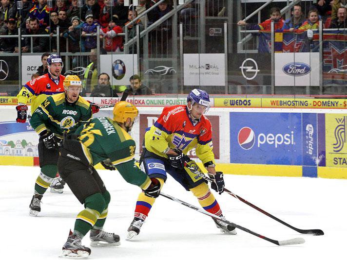 První lepší šanci měli domácí. Luboš Rob vybojoval kotouč v souboji u mantinelu a poslal ho na Josefa Mikysku, který to zkusil hned z první. Střelu z nápřahu se ale Šurému podařilo na poslední chvíli vyrazit. Ve třetí minutě chtěl rozhodčí vylučovat jednoho z domácích hráčů, avšak Tomáš Frolo předvedl hezké gesto a nepřesný verdikt sudích odvolal. V polovině první třetiny dostával přihrávku před branku kapitán Vsetínských Jaroslav Markovič, těsně před Kváčou se ale do zakončení nedostal. Po dvou minutách už mohli být vsetínští fanoušci o něco spokojenější. Ondřej Slováček dostal nabito na vrchol kruhu a odtud prostřelil až do horní části Kváčovy svatyně. Na půdě favorita tedy hostující celek vedl 1:0. Mohlo být vyrovnáno pár minut před koncem třetiny, nicméně Michal Šurý proti Nejezchlebovi, jenž stál zády ke vsetínské brance, zasáhl svou hokejkou parádně a kotouč vypíchl. Naopak na druhé straně mohl navýšit vedení Tomáš Vávra. Šikovně se vyhnul obránci a zamířil do pravé části Kváčovy branky. Domácí brankář si ale nebezpečnou střelu za pomoci vyrážečky pohlídal. Zbývalo pár sekund do konce třetiny a krásnou individuální akcí se prezentoval Miloslav Čermák, který obešel obránce a dostal se až do zakončení, jenže z bekhendu trefil jen připraveného Michala Šurého. Po první třetině tedy stále trvalo vedení svěřenců Jiřího Dopity.